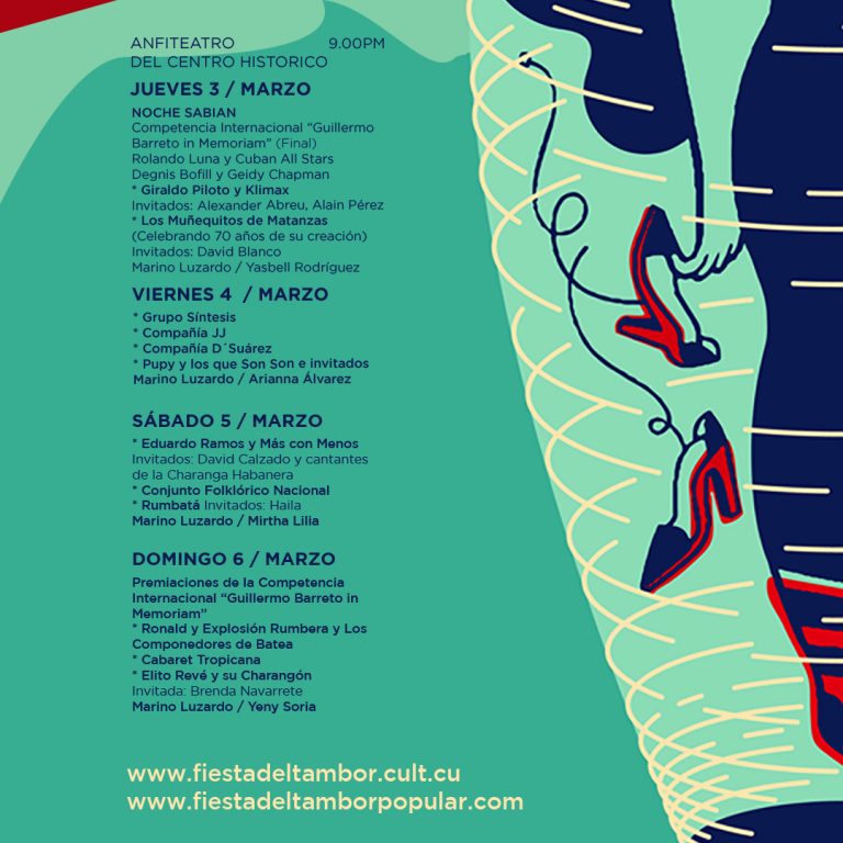 El Ministerio de Cultura, ARTEX y el Gobierno de la Ciudad, convocan a la XIX Edición del Concurso y Festival Internacional Fiesta del Tambor “Guillermo Barreto in Memoriam”, que se realizará en la Habana, del 01 al 06 de Marzo de este 2022 en múltiples sedes como: Hotel Nacional de Cuba, el Arco de Belén en La Habana Vieja y el Anfiteatro del Centro Histórico. Dentro del programa del evento este año sólo se realizará el concurso de Percusión.