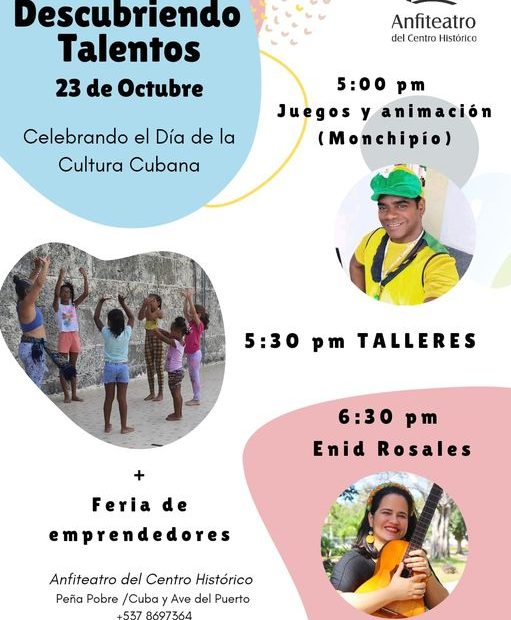 El Domingo 23 de octubre celebraremos el Día de la Cultura Cubana con una jornada creativa para niños. A partir de las 5 de la tarde se darán cita artistas, emprendedores y profesores para jugar, aprender y disfrutar de la música juntos, en un espacio gestado desde nuestro teatro, y que llamamos “Descubriendo Talentos.”