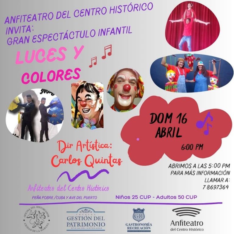 Este domingo 16 de abril y el próximo domingo 23 el ANFITEATRO DEL CENTRO HISTÓRICO le invita a los Espectáculos Infantiles “LUCES Y COLORES”, dirigidos por el excelente actor Carlos Quintas.